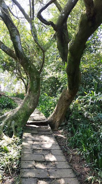 兩棵不小的樹,彎曲的樹幹,擋在山道中,看來是在成長階段,受到風力吹拂的影響,日久天長所致。脊椎側彎也是如此。