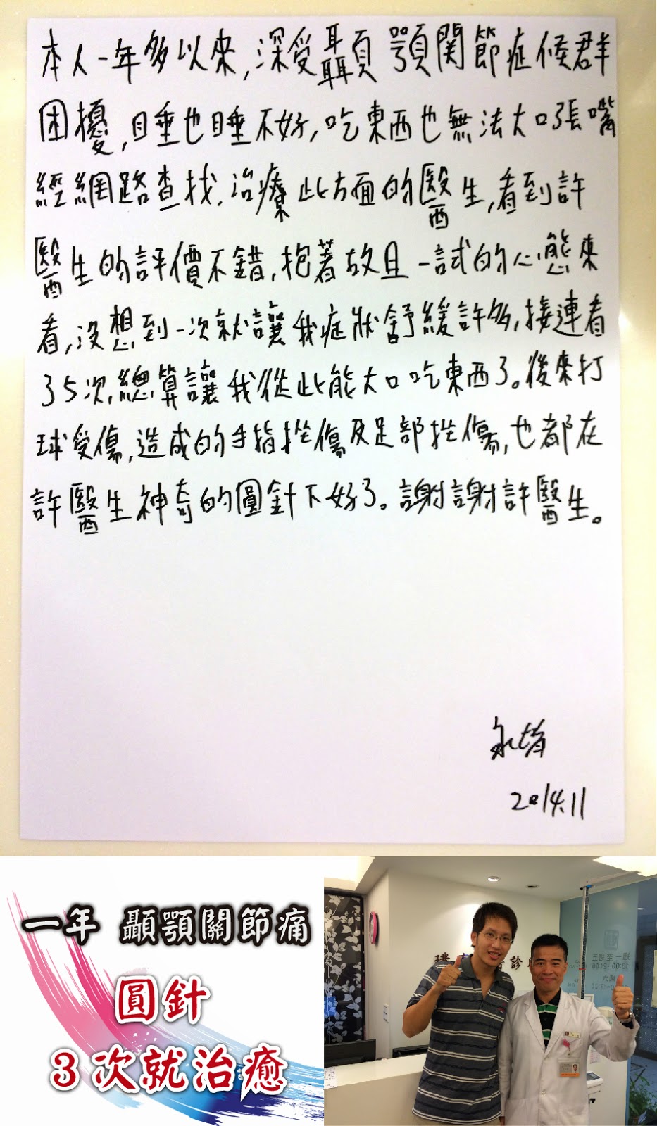 而「圓針」治療顳顎關節痛,則有如導彈直擊,快速的改善肌緊現象,在極小針刺的傷口下,直接治療患部,放鬆緊張肌群而達到理想的效果。所以只花了三次,就把永堉處理了半年治不好的嘴巴搞定啦!