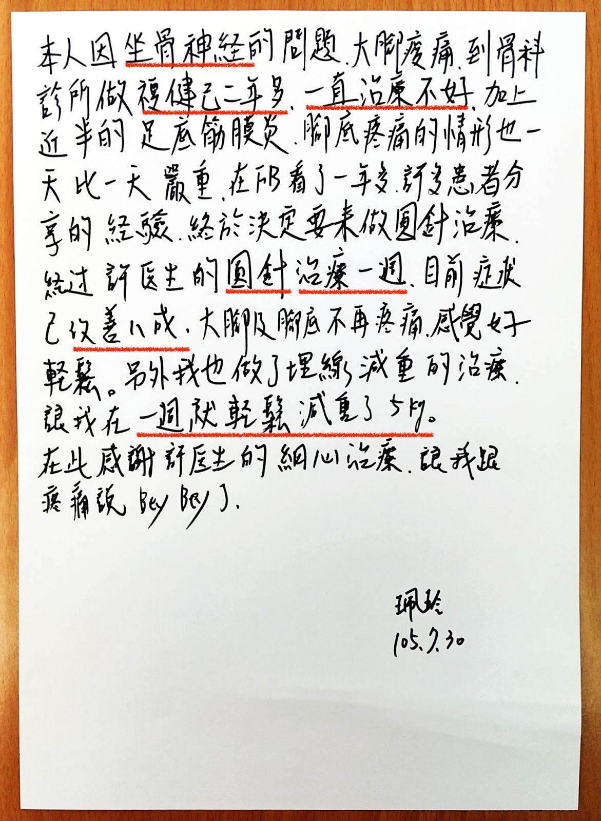 珮玲因為坐骨神經痛、大腿酸痛,去復健科報到了兩年多,沒好…。近半年更慘,還多加上了足底筋膜炎,腳底日漸嚴重…,在FB看了一年多很多患者來許醫師這邊用圓針治療的案例,牙一咬終於鼓起勇氣來了。用圓針治療一次,症狀就改善了8成,大腿、腳底都不再疼痛,真的是跟圓針相見恨晚。