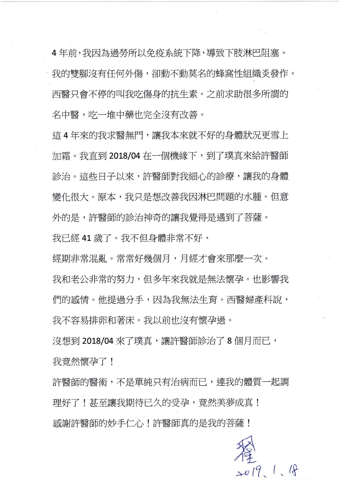 許醫師的醫術,不是單純只有治病而已,連我的體質一起調理好了!甚至讓我期待已久的受孕,竟然美夢成真!