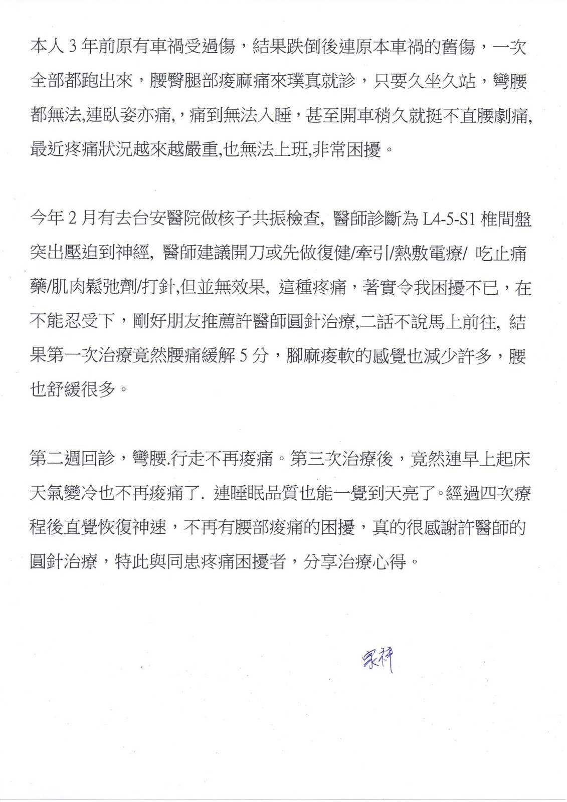 今年2月有去台安醫院做核子共振檢查, 醫師診斷為L4-5-S1椎間盤突出壓迫到神經,醫師建議開刀或先做復健牽引、熱敷電療、吃止痛藥、肌肉鬆弛劑、打止痛針,但並無效果,這種疼痛,著實令我困擾不已,在不能忍受下,剛好朋友推薦許醫師圓針治療,二話不說馬上前往,結果第一次治療竟然腰痛緩解5分,腳麻痠軟的感覺也減少許多,腰也舒緩很多。