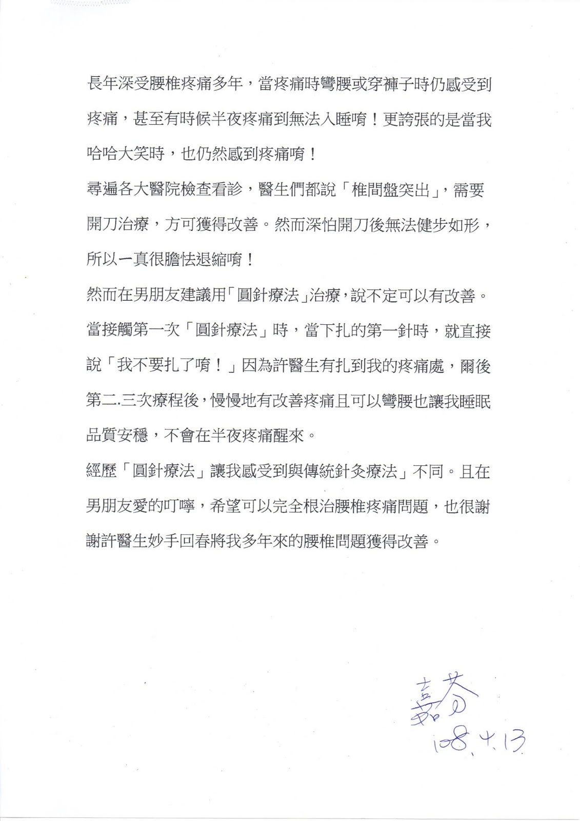 經歷「圓針療法」讓我感受到與傳統針灸療法不同。且在男朋友愛的叮嚀,希望可以完全根治腰椎疼痛問題,也很謝謝許醫生妙手回春將我多年來的腰椎問題獲得改善。